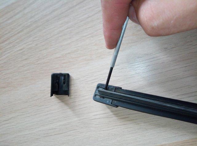 Сначала снимаем более длинный дворник. По краям щётки расположены пластиковые заглушки. Одна из них отвечает за фиксацию резинки. Для того чтобы понять, какая именно заглушка нам нужна, двигаем старую резинку вправо-влево. Снимать необходимо ту заглушку, которая не двигается. Поддеваем её с помощью плоской отвёртки, но так, чтобы не повредить, пластик может быть довольно хрупким. Под заглушкой должен скрываться металлический фиксатор резинки.